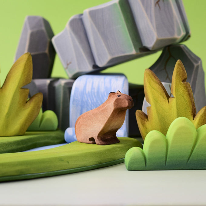 Deze prachtige Capibara en alle andere houten speelfiguren van Bumbu Toys worden met de hand gemaakt door een klein familiebedrijf in Roemenië. Daarbij wordt gebruik gemaakt van verschillende soorten lokaal hardhout.