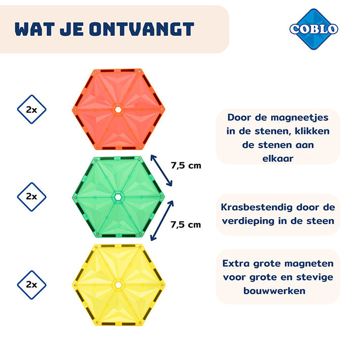 Deze set met 6 grote magnetische tegels in de vorm van een zeshoek is een leuke aanvulling op de basis sets van Coblo. De hexagon tegels geven je nog meer mogelijkheden om de meest fantastische bouwwerken te maken. Coblo is een nederlands merk en de Coblo tegels staan bekend om de zeer sterke magneten en stevige constructie.