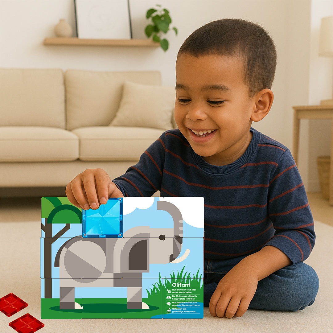 Verander je Coblo bouwwerken in verschillende leuke dieren met deze 60 magnetische toppers. Zoek de juiste kaartjes bij elkaar en verander de gewone Coblo tegels in bijvoorbeeld een olifant, aap of flamingo.