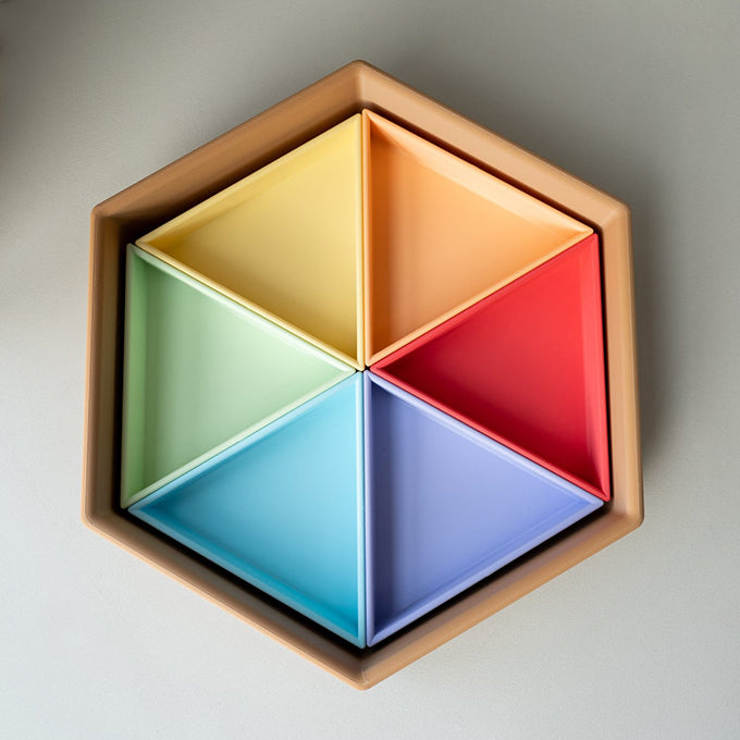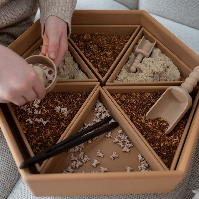 De zeshoekige speelbak van Grennn is een fijne speelbak om lekker aan de slag te gaan met Magic sand, speelrijst, schepjes, bakjes en ander sensorisch materiaal.