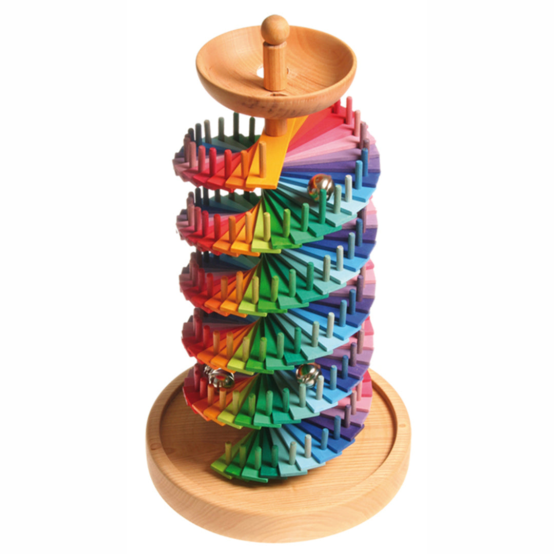 Met deze bouwset maak je je eigen knikkerbaan! De set bestaat uit een stevige grondplaat, een ronde stok, 80 houten plankjes met 176 deuvels in heldere regenboogkleuren en een startkommetje. Bij de bouwset zijn 4 metalen belletjes geleverd maar je kunt ook eigen knikkers en balletjes gebruiken. Luister naar het verschil in klank bij verschillende balletjes en knikkers. Welke knikker is het eerst beneden, de grote of de kleine? Grimm's speelgoed laat volop ruimte voor eigen de fantasie en creativiteit van kinderen: je kunt de knikkerbaan eindeloos uit elkaar halen en weer opnieuw in elkaar zetten in een andere kleurvolgorde.