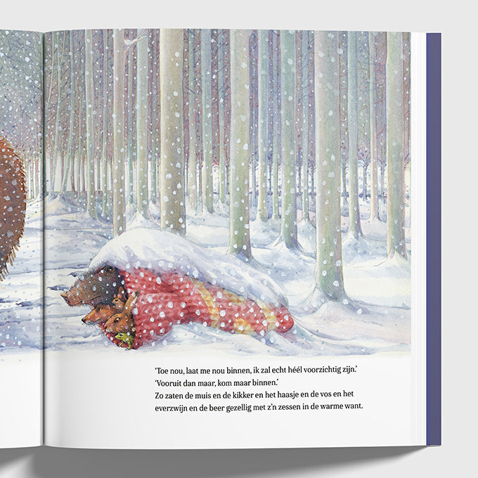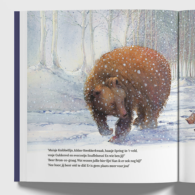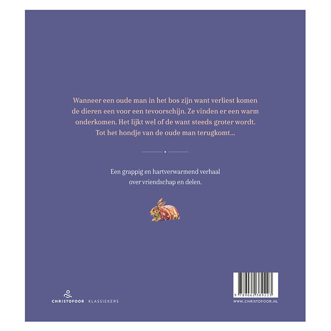 Wanneer een oude man in het bos zijn want verliest, vormt die voor muisje knibbelfijn, kikker Kwekkerkwaak, haasje Spring in 't veld, vosje Guldenvel, everzwijn Snuffelneus en beer Brom-zo-graag een fijn onderdak. Het lijkt wel of de want steeds groter wordt. Tot het hondje van de oude man terugkomt.