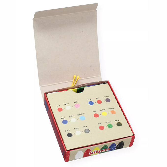 Met Kitpas krijt kleur je op papier, ramen, glas, whiteboards en spiegels. Eenvoudig te verwijderen met een natte doek (niet van papier). Met een klein beetje water erbij kan je ook verven met de krijtjes. Op het doosje vind je kleursuggesties om te mengen.