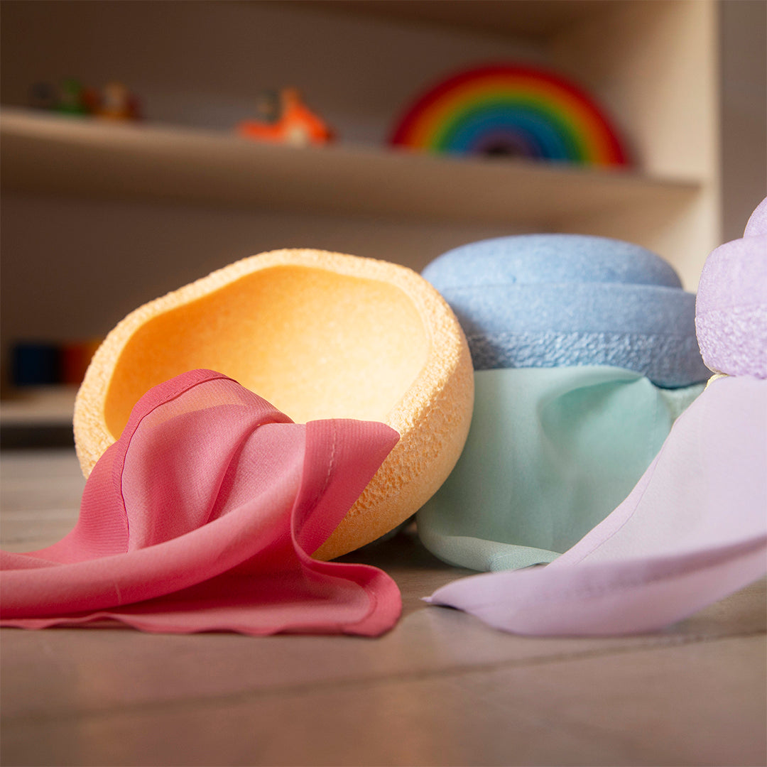 Het open einde speelgoed stimuleert de creativiteit en fantasierijk spel. Kleine kinderen vanaf 4 maanden ontdekken kleuren en texturen en vinden het leuk om de doeken uit een permanence box te trekken. ( bv de Grapat permanence box )