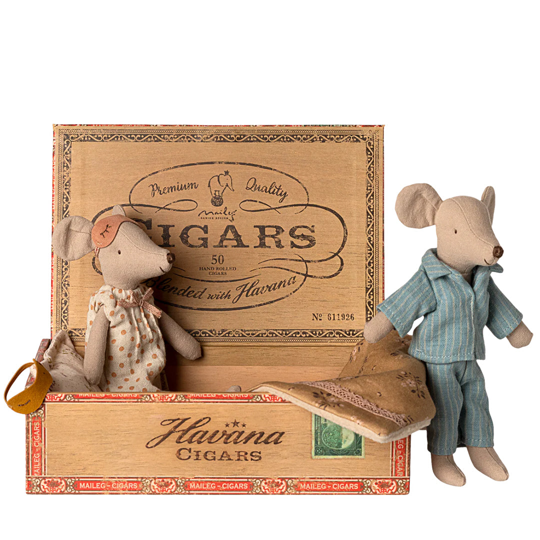 Vader en moeder muis hebben een mooie sigarendoos gevonden en deze tot een fijn bed omgetoverd. Vader heeft een goed matras en een zachte kussens op de kop getikt en moeder heeft een warm deken gemaakt. Vader en moeder liggen graag in bed, in hun fijne pyjama en met slaapmaskertje op ( de pyjama's en slaapmaskertjes kunnen aan- en uitgetrokken worden ).